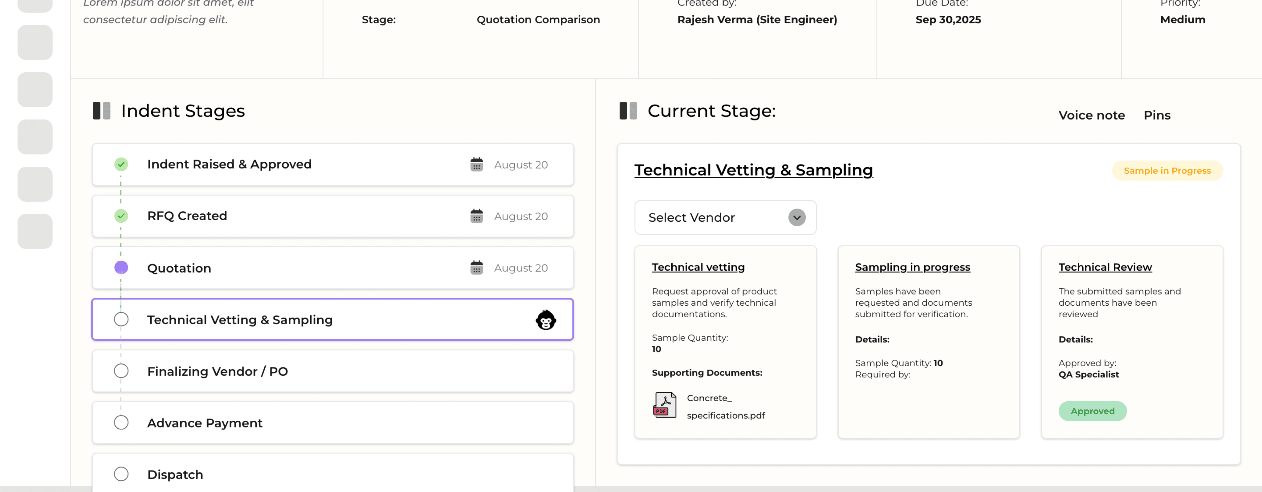 A site engineer needs 20mm rebar for foundation work โ a common request that typically involves multiple calls, WhatsApp messages, and manual tracking across departments.