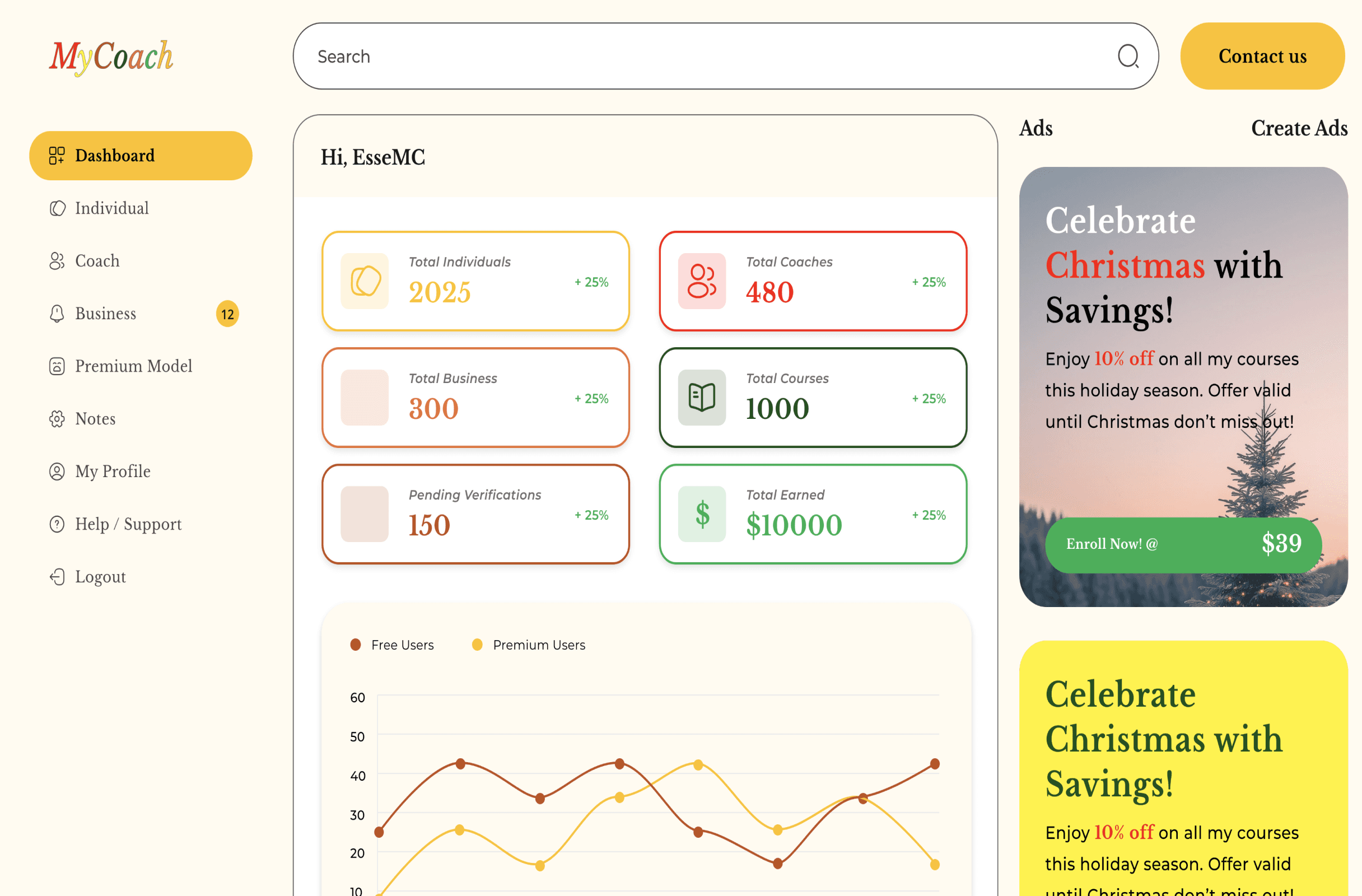 Businesses and admins access dashboards that provide visibility into learners, coaches, sessions, and overall activity, enabling scale without manual tracking.